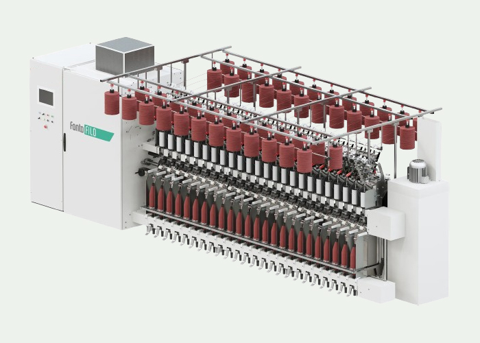 Electronic computer controlled type for the production of fancy yarn from yarn, one hollow spindle and one ring spindle, take-up on tube.
